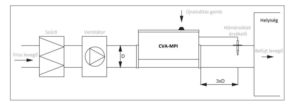 • Kör keresztmetszetű légcsatornába. Az elektromos fűtőkalorifer vízszintesen telepíthető úgy, hogy az elektromos csatlakozódoboz felfelé vagy oldalra néz
