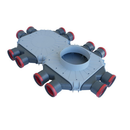 Tizenkét csatlakozós lapos osztó-gyűjtő , levegőelosztó elem szellőztető és hővisszanyerő egységekhez , tartós polietilénből.