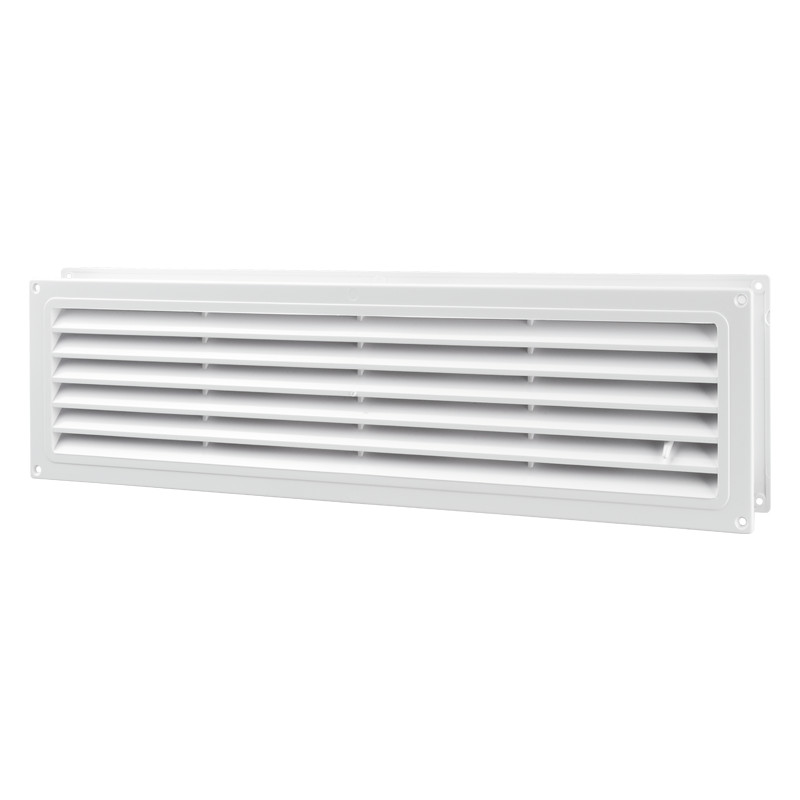 Műanyag takaróelem lakossági, közületi vagy ipari szellőzőrendszerek be- és elszívónyílásainak lezárására. Fehér szín, négyszögletes kialakítás. Szabályozható zsaluval. Csőcsatlakozás nélkül. 462x124 mm. Párban csomagolva.
