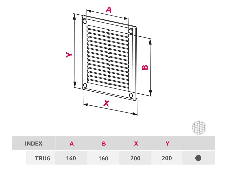 Awenta TRU6 négyszögletes fali rács 200X200, rovarhálóval, fehér színben
