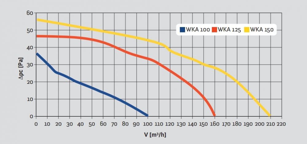 A WKA elérhető alap és időzítős (T) kivitelben. Az időzítős változat beépített, állítható időrelével (3-30 perc) rendelkezik. Három méretben kapható: 100, 125 és 150 mm. A beszereléshez KO100-21 csatlakozó szükséges!