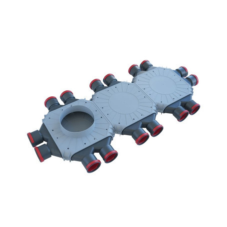 Lapos elosztó tizenhat csatlakozóval, levegőelosztó elem szellőztető és hővisszanyerő egységekhez , tartós polietilénből.